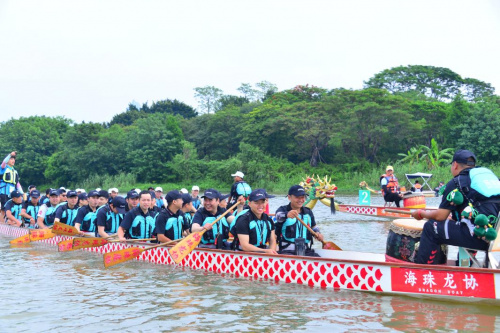 活动当天上午9:30,骑士们齐聚珠江边。在点睛仪式后,骑士们便正式开始了龙舟学习。教练通过“讲解+示范”的方式,细致地传授划桨角度、队伍行进策略等。骑士们认真学习,在不断的训练中逐渐掌握了划行技巧。