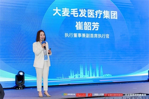 在主题演讲环节,崔韶芳女士全面阐述了大麦微针植发的发展理念与实践成果。她首先感谢高促会的诚挚邀约,并表示很高兴大麦微针植发能够作为大湾区科技创新力量之一,在本次盛会分享品牌的科技创新成果。